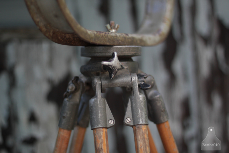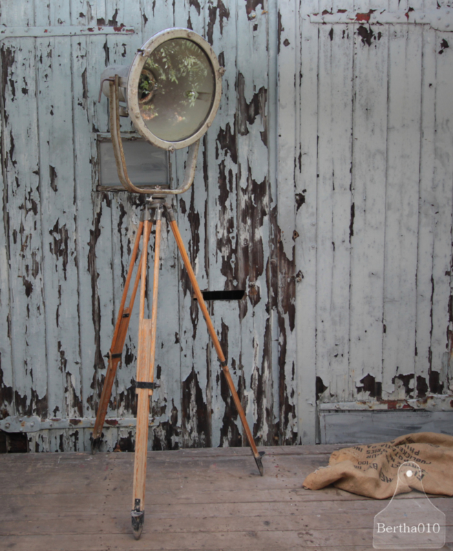 Oude fabriekslamp op houten statief (136541) verkocht
