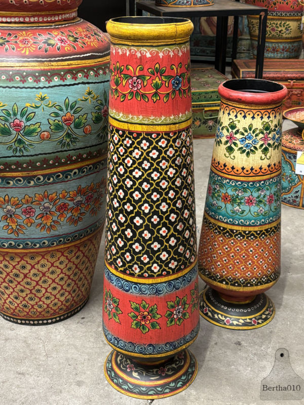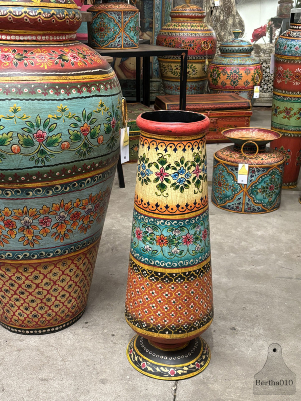 Oosterse houten melkpot handgemaakt kunstwerk voor je interieur 147886q 36 cm hoogHoge handbeschilderde houten pot India handbeschilderde melkpot unieke hoge pot kleurrijke waterkruik India Ibiza stijl houten potten art pot India handbeschilderde melkpotten India handbeschilderde houten pot beschilderd